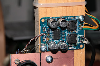 And now the "electrification", as it were. The month before i finally bit the bullet, and placed my first AliExpress order ever, for 15pcs of the little Sanwu-clone TPA3118D2 class-D amplifier boards. Configured as parallel-bridge-tied-load, supplied at 24V, they should be able to push a clean 60W or so into a 4ohm load. In this application though, they'll be supplied with 19V (from older laptop chargers - cheap power!), and since the speakers are rated at 6ohms, that'll be a 3ohm load nominally. That should result in roughly 50W or so, near clipping - way more than plenty, for the application. Nothing wrong with having loads of headroom though, especially with the 30mA or so idle current draw of these little boards. I'm still having trouble getting over how friggin' tiny these things are - less than half (about 40%) of a credit card!